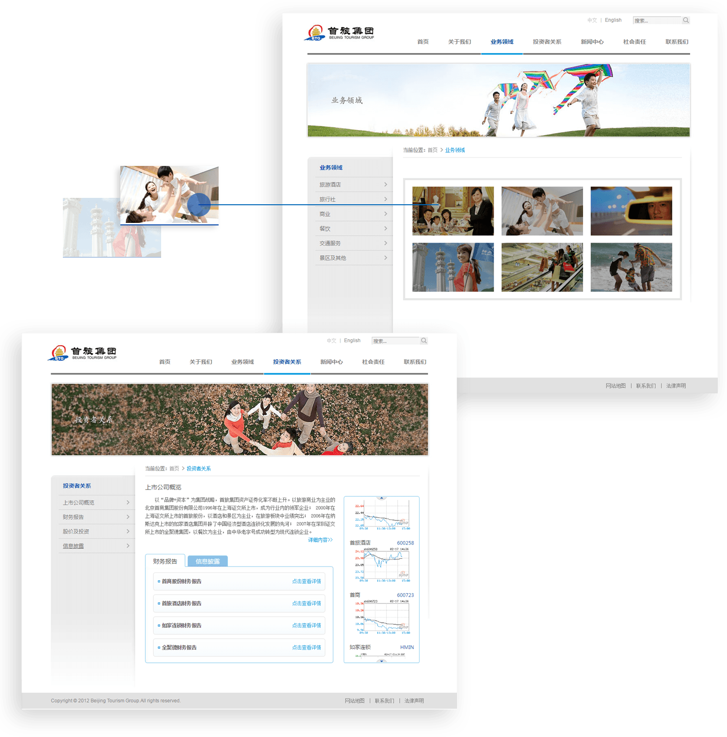 網(wǎng)站以“歷史與現(xiàn)代”相結(jié)合的視覺效果,表現(xiàn)首旅集團作為知名的旅游服務(wù)企業(yè)的品牌形象。