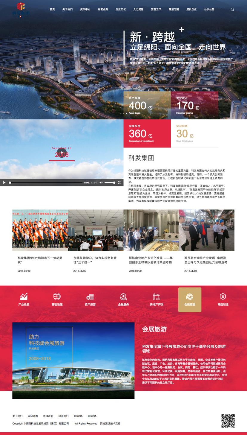 設(shè)計風(fēng)格以現(xiàn)代化、簡約化、國際化為主,紅色作為主色,黃色作為配色,整體視覺效果與科發(fā)集團VI系統(tǒng)保持一致,構(gòu)成統(tǒng)一的品牌視覺識別系統(tǒng)。同時,頁面通過色塊方格、扁平化圖標、視頻應(yīng)用等創(chuàng)新設(shè)計元素提升視覺表現(xiàn)力,通過HTML5/JS/CSS3等技術(shù)實現(xiàn)良好的交互效果,每一步操作,都能為用戶帶來良好的用戶體驗。