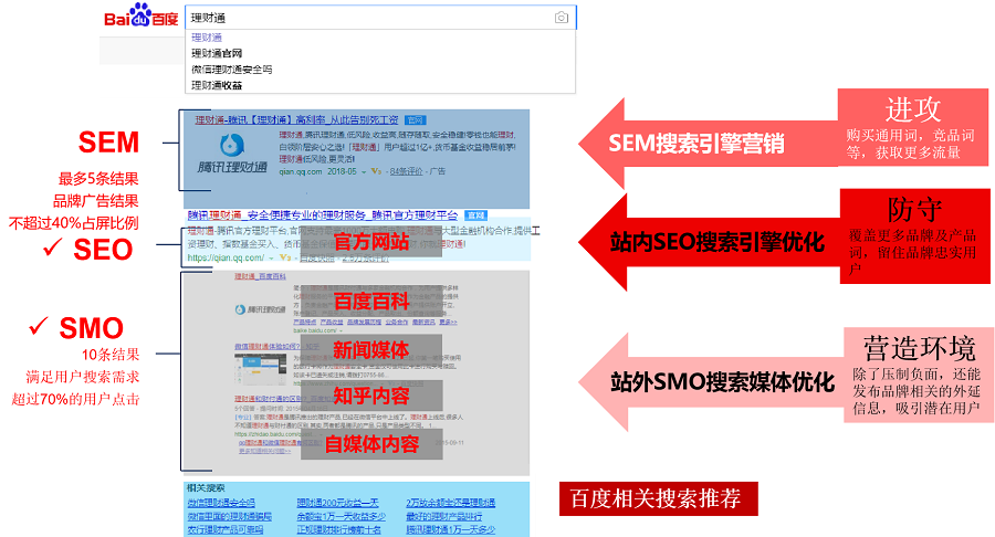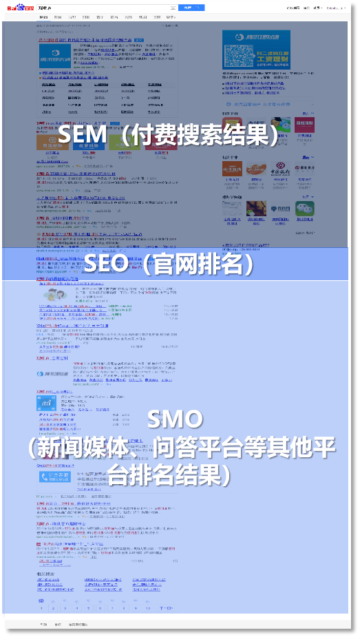 通常情況下用戶在搜索引擎中查詢企業(yè)時,SEM、SEO、SMO的信息呈現(xiàn)順序如下圖:
