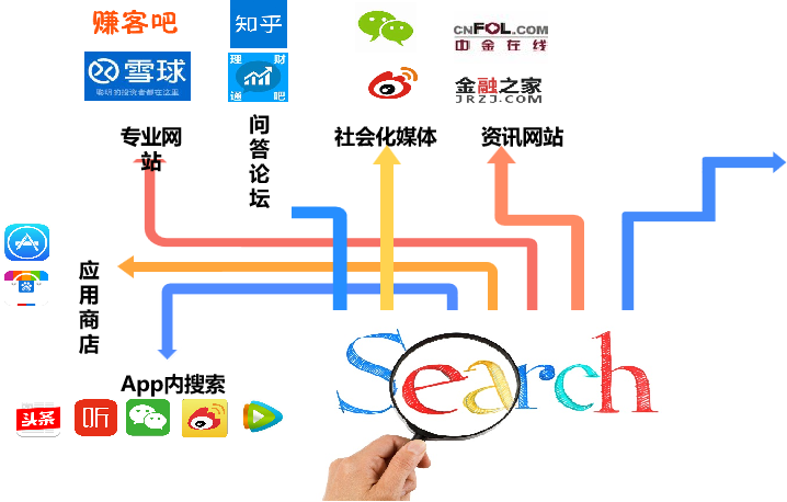 據(jù)不完全統(tǒng)計,搜索環(huán)境隨著互聯(lián)網(wǎng)發(fā)展變遷,人們在獲取信息時,不僅僅只會通過某一類搜索引擎作為信息來源,而是會通過多種渠道進行查詢,綜合分析后產(chǎn)生購買決策。在泛搜索環(huán)境下用戶認知品牌觸點逐漸多樣化,例如除百度之外的:購物網(wǎng)站、地圖、新聞門戶、微博、旅行網(wǎng)站等。 “搜索”無處不在,這便意味著“用戶”隨時可能獲取。