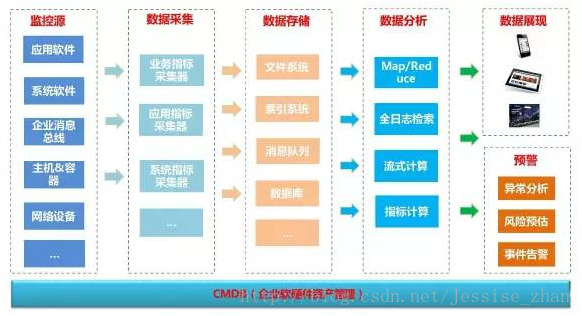 統(tǒng)一監(jiān)控平臺由七大角色構(gòu)成:監(jiān)控源、數(shù)據(jù)采集、數(shù)據(jù)存儲、數(shù)據(jù)分析、數(shù)據(jù)展現(xiàn)、預警中心、CMDB(企業(yè)軟硬件資產(chǎn)管理)。