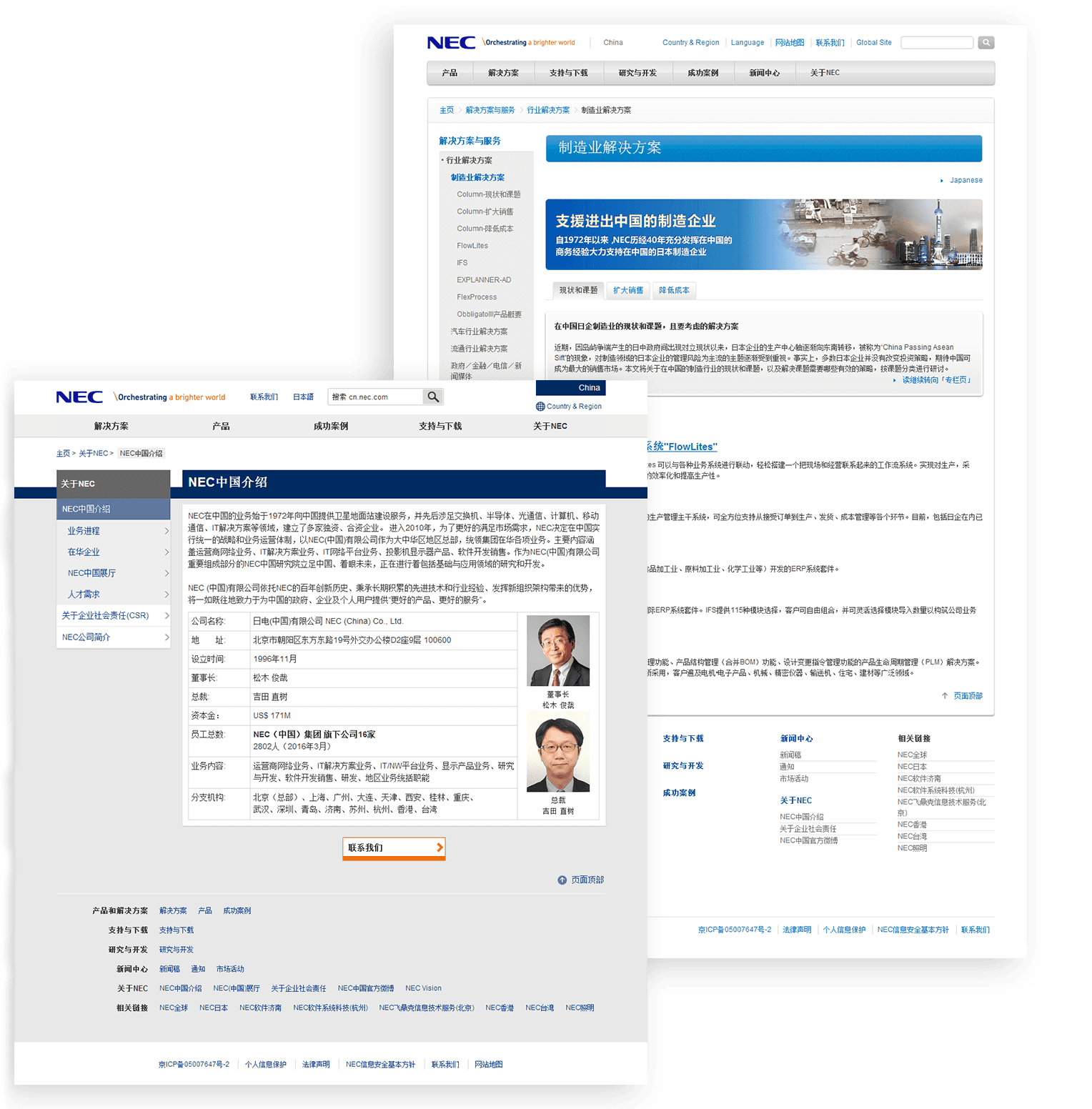 新鴻儒為NEC及旗下子公司建立中文網(wǎng)站群,實現(xiàn)后臺統(tǒng)一管理,同時規(guī)范網(wǎng)站群WEB視覺識別體