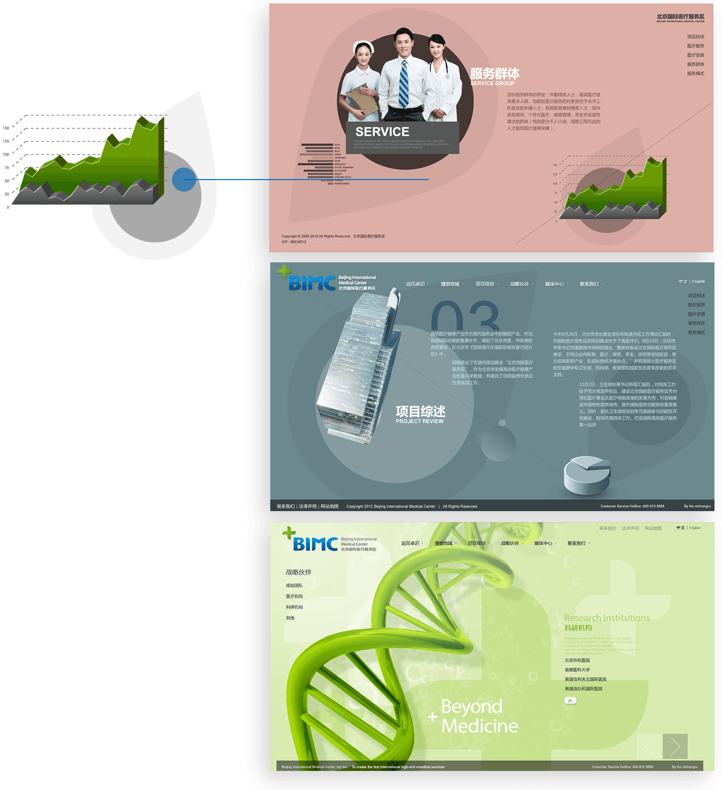 網(wǎng)站利用視頻元素和FLASH技術(shù),實(shí)現(xiàn)三維立體的動(dòng)畫(huà)表現(xiàn),展示北京國(guó)際醫(yī)療服務(wù)區(qū)全貌,形成強(qiáng)烈的視覺(jué)感受,塑造北京國(guó)際醫(yī)療服務(wù)區(qū)的品牌形象。同時(shí),網(wǎng)站中大量鼠標(biāo)交互效果,充分調(diào)動(dòng)訪問(wèn)者的興趣,提升用戶(hù)的瀏覽體驗(yàn)。