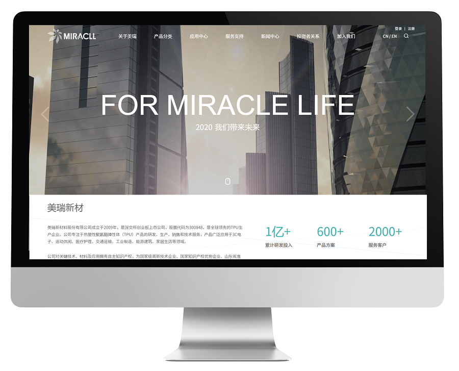 美瑞新材料對關(guān)鍵技術(shù)、材料及應(yīng)用擁有自主知識產(chǎn)權(quán),為國家級高新技術(shù)企業(yè)、國家知識產(chǎn)權(quán)優(yōu)勢企業(yè)、山東省準獨角獸企業(yè)、山東省瞪羚示范企業(yè)。公司始終堅持以客戶滿意和為客戶創(chuàng)造價值為導(dǎo)向,踐行專業(yè)、可靠、創(chuàng)新、合作、環(huán)保的經(jīng)營理念,為客戶提供高效、低成本的差異化產(chǎn)品解決方案,在向客戶提供高性能TPU產(chǎn)品的同時,也為其提供個性化、專業(yè)化的技術(shù)服務(wù),滿足其定制化需求。本次網(wǎng)站的全新搭建,使美瑞新材料在互聯(lián)網(wǎng)領(lǐng)域展現(xiàn)出全新的品牌形象。
